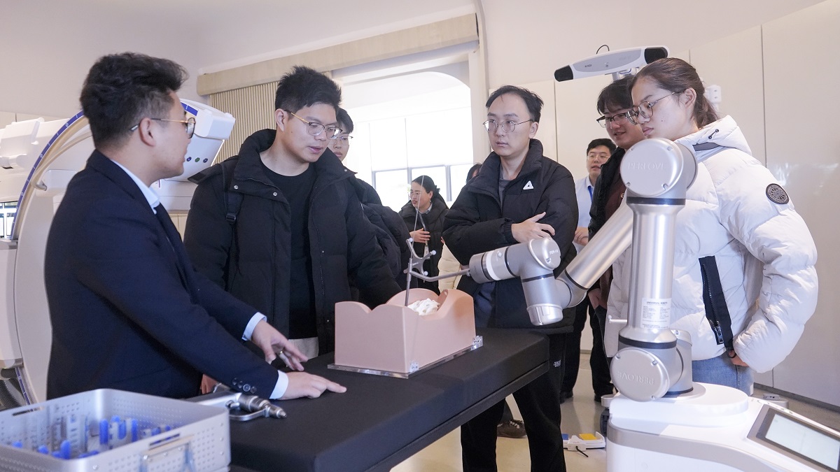 在創(chuàng)新成果展示區(qū),研學(xué)團(tuán)觀摩了手術(shù)機(jī)器人、移動(dòng)式三維C形臂等設(shè)備,詳細(xì)了解設(shè)備的研發(fā)理念、技術(shù)優(yōu)勢(shì)及臨床應(yīng)用場(chǎng)景?! ?/p>