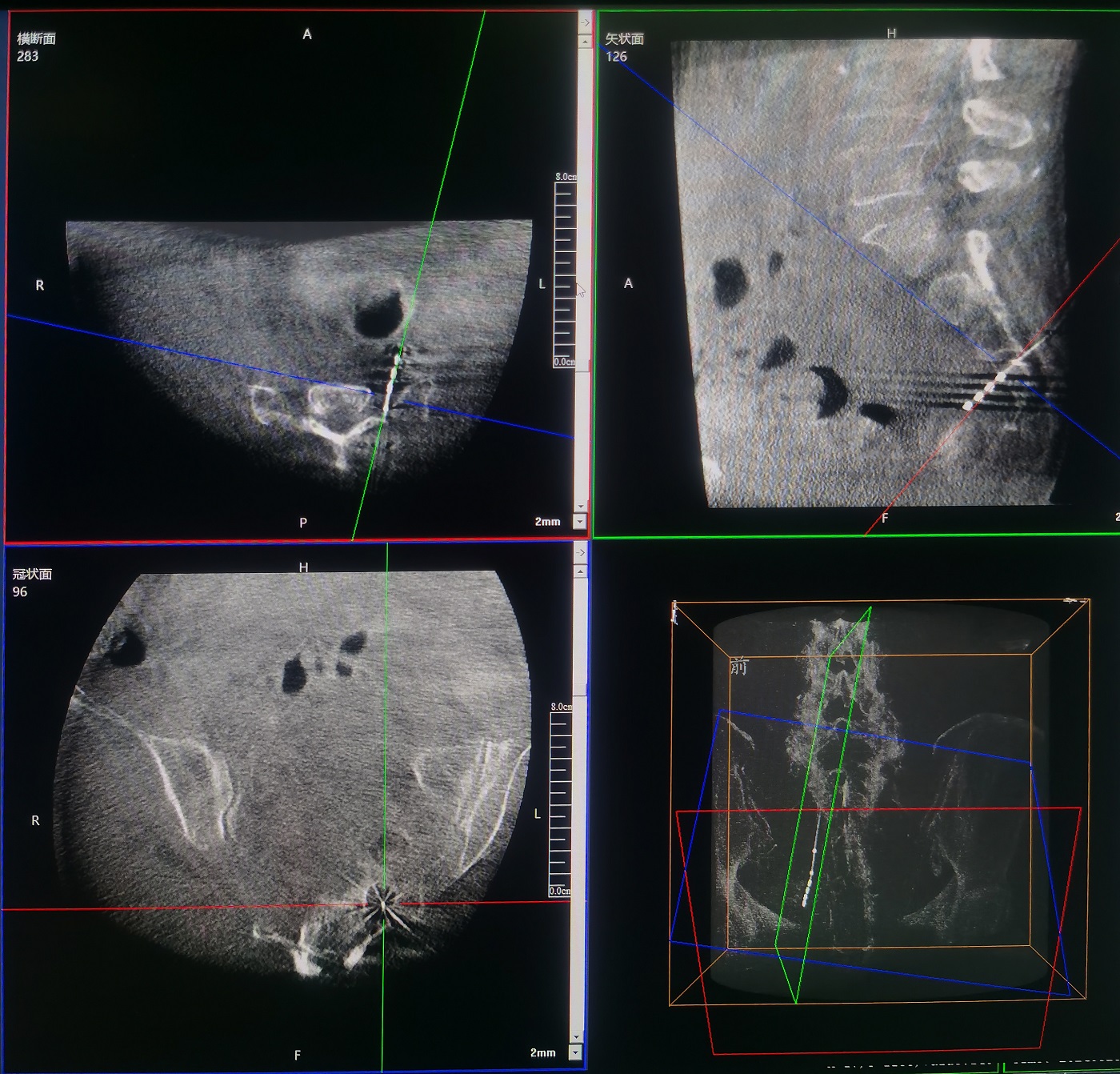 術(shù)中,運(yùn)用普愛醫(yī)療三維C形臂環(huán)掃,采集骶骨區(qū)域三維圖像,在機(jī)器人導(dǎo)航界面上進(jìn)行路徑規(guī)劃,自動(dòng)引導(dǎo)進(jìn)入骶3神經(jīng)孔。