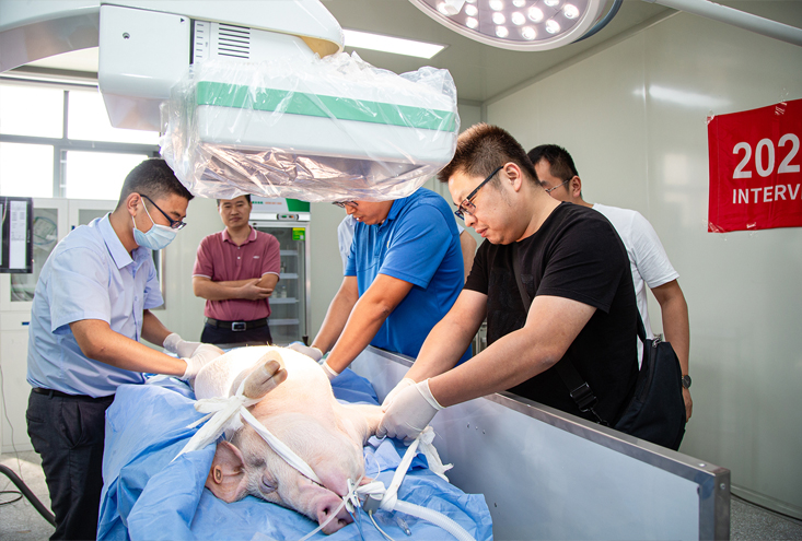 所有理論課程結(jié)束后,我們安排了動物介入實操及觀摩,由南京市第一醫(yī)院、南京醫(yī)科大學專家及團隊現(xiàn)場指導(dǎo)和操作,主要目的是讓我們學員更深刻的了解介入醫(yī)學,通過本次臨床實操,讓他們對手術(shù)流程,相關(guān)器械之間的配合及手術(shù)技巧能更好的掌握。
